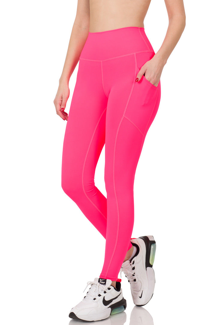 Athletic Wide Waistband Full Length Leggings - Neon Pink