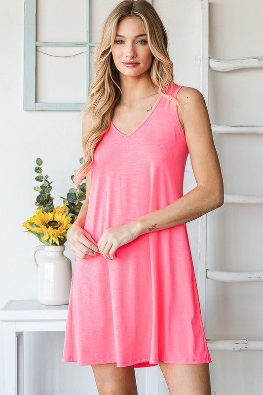 95% POLYESTER 5% SPANDEX SLEEVELESS V NECK SOLID BULGARI MINI DRESS WITH SIDE POCKET DETAIL