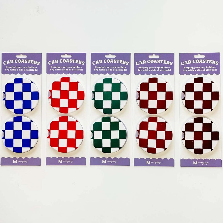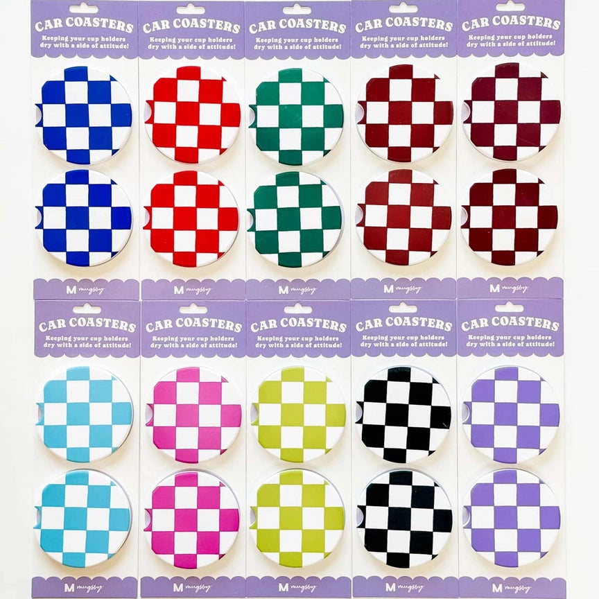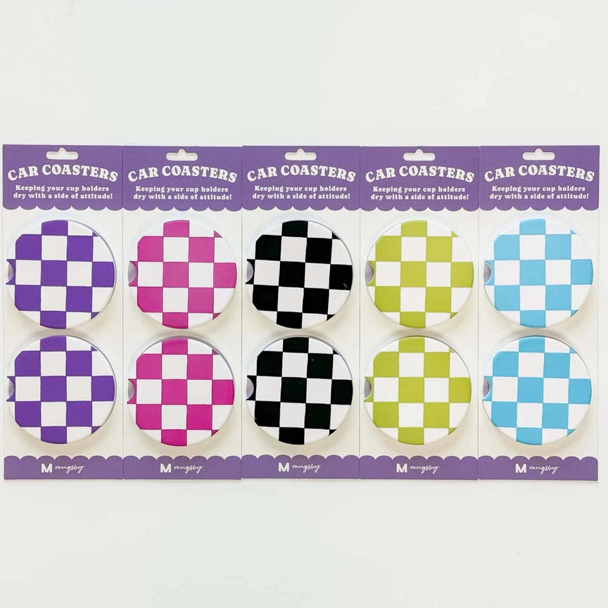 Ceramic car coaster sold as a set of two. Fun Checkered pattern in a selection of colors.