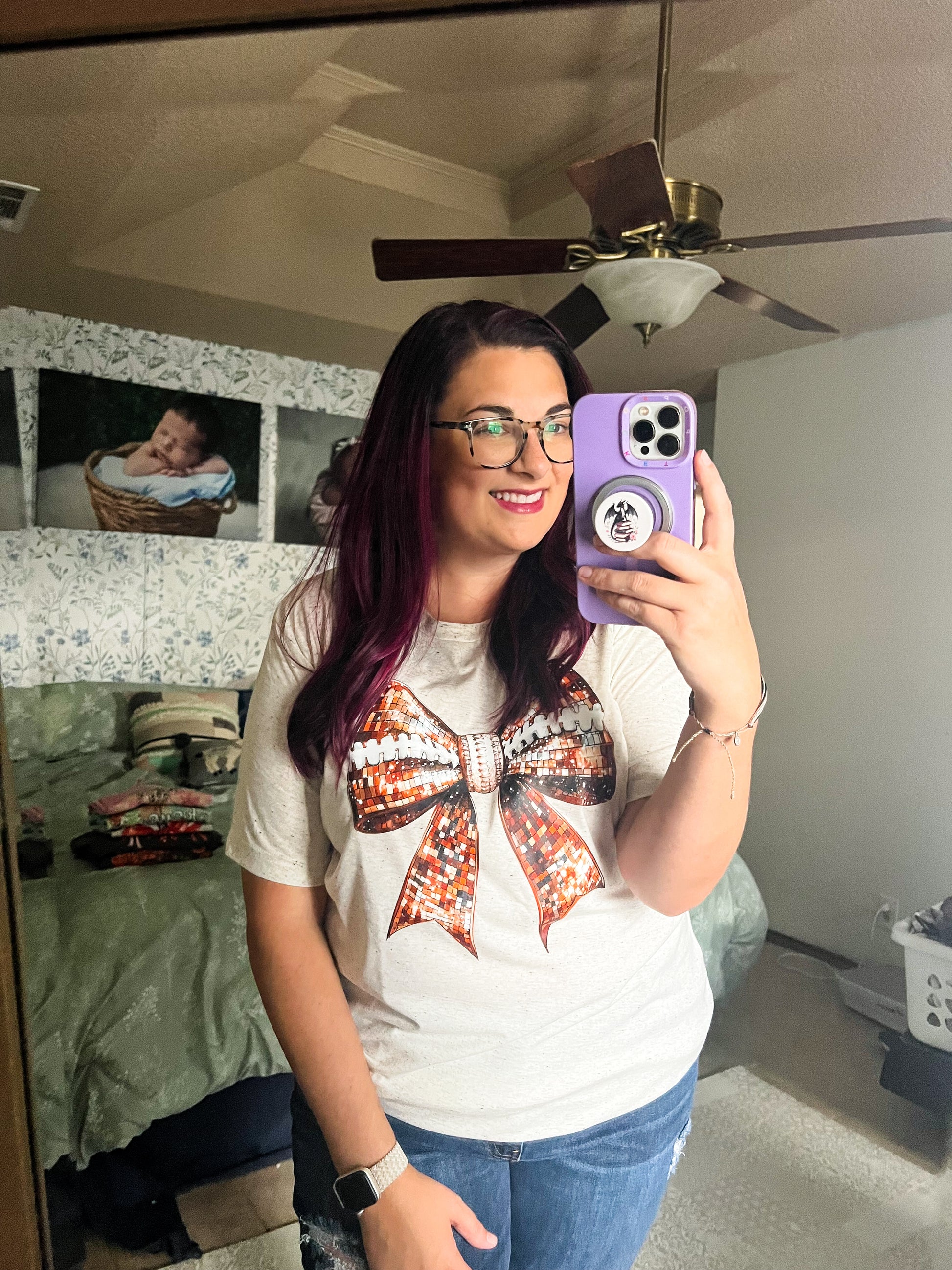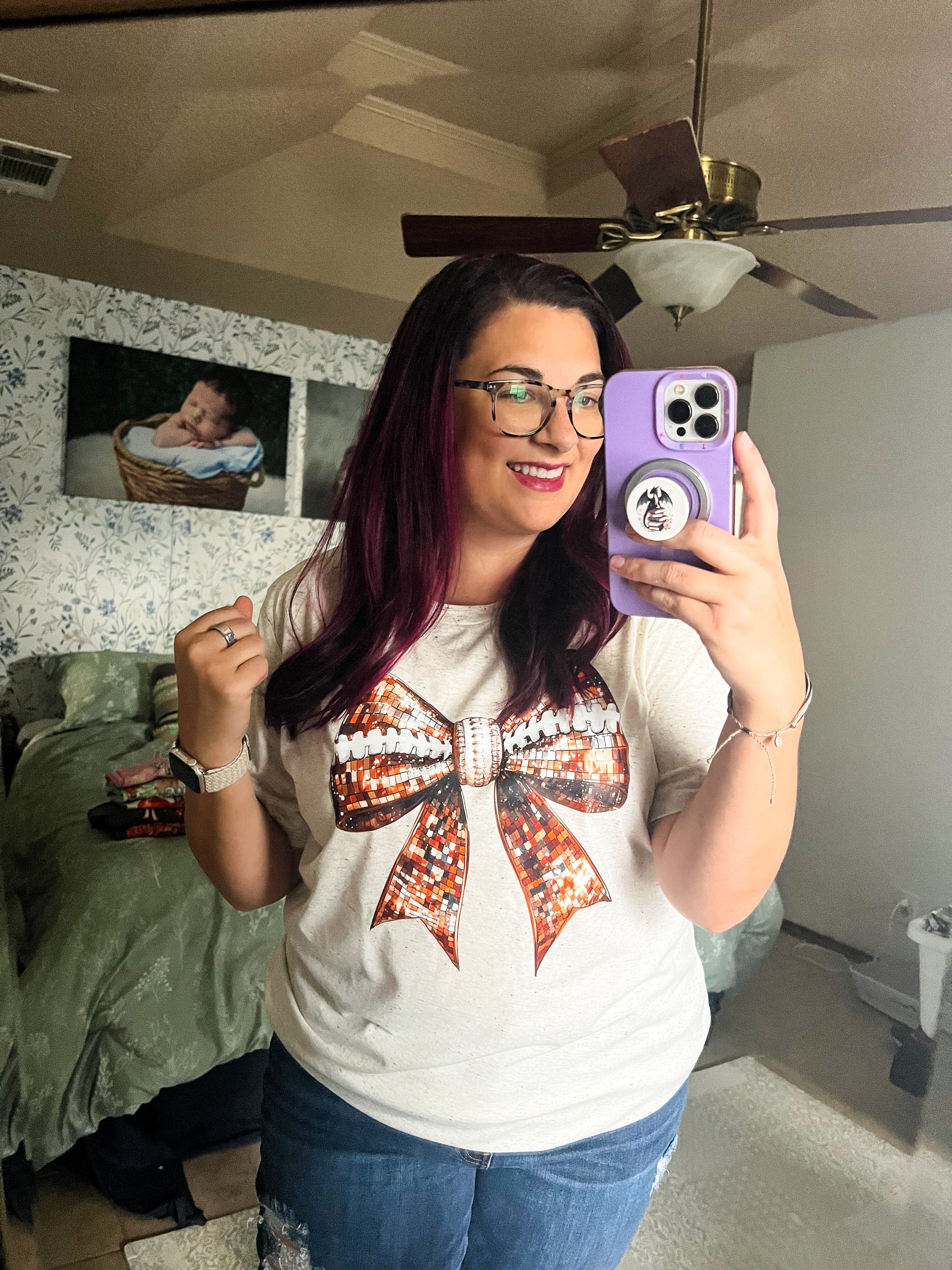 Disco Football Croquette Bow on oatmeal fleck bella canvas tee