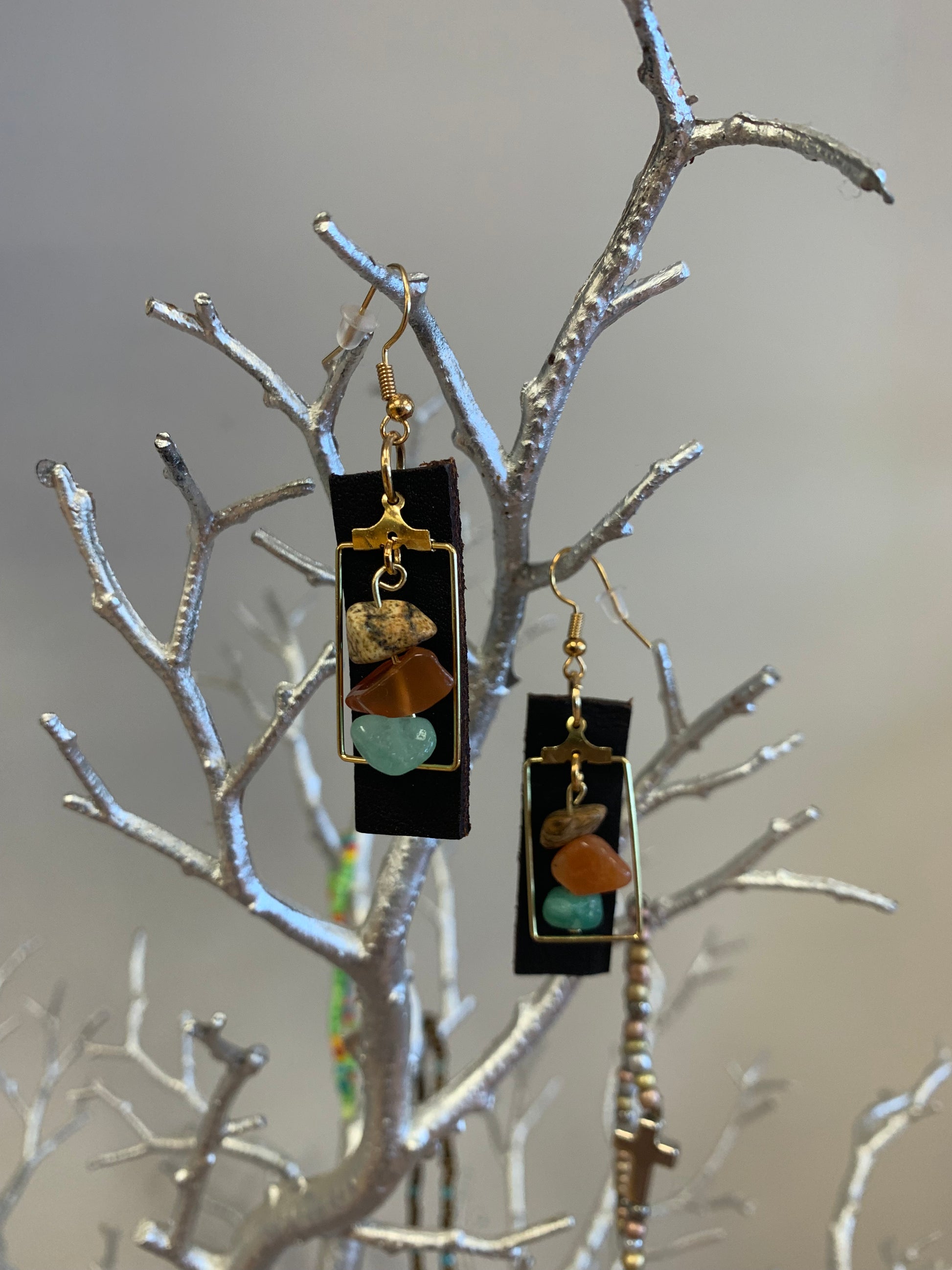 Gemstone and Leather earrings. Gold tone, bronze or copper ear wires. No two will be alike! Handmade in Texas.