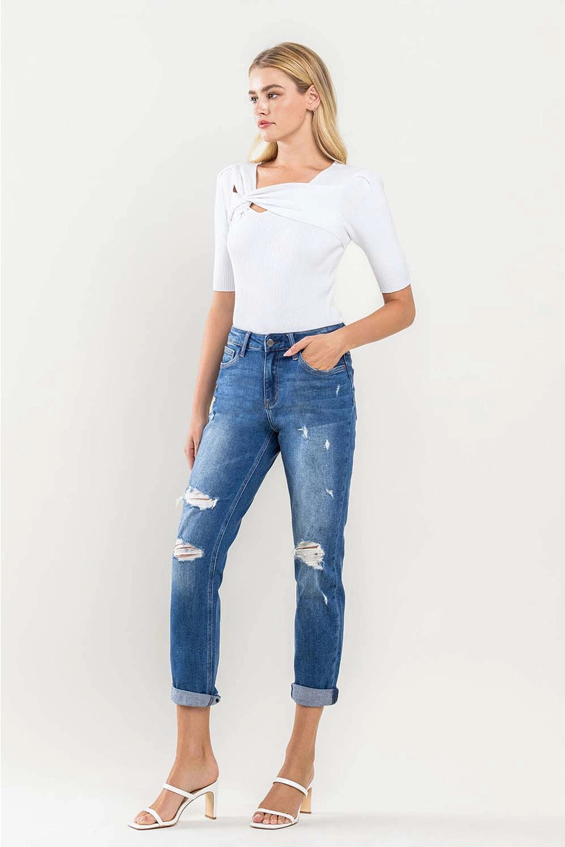 High rise distressed cuffed boyfriend jeans Comfort stretch denim, high rise waist, distressed detail, double cuff hem, cropped length, boyfriend jeans