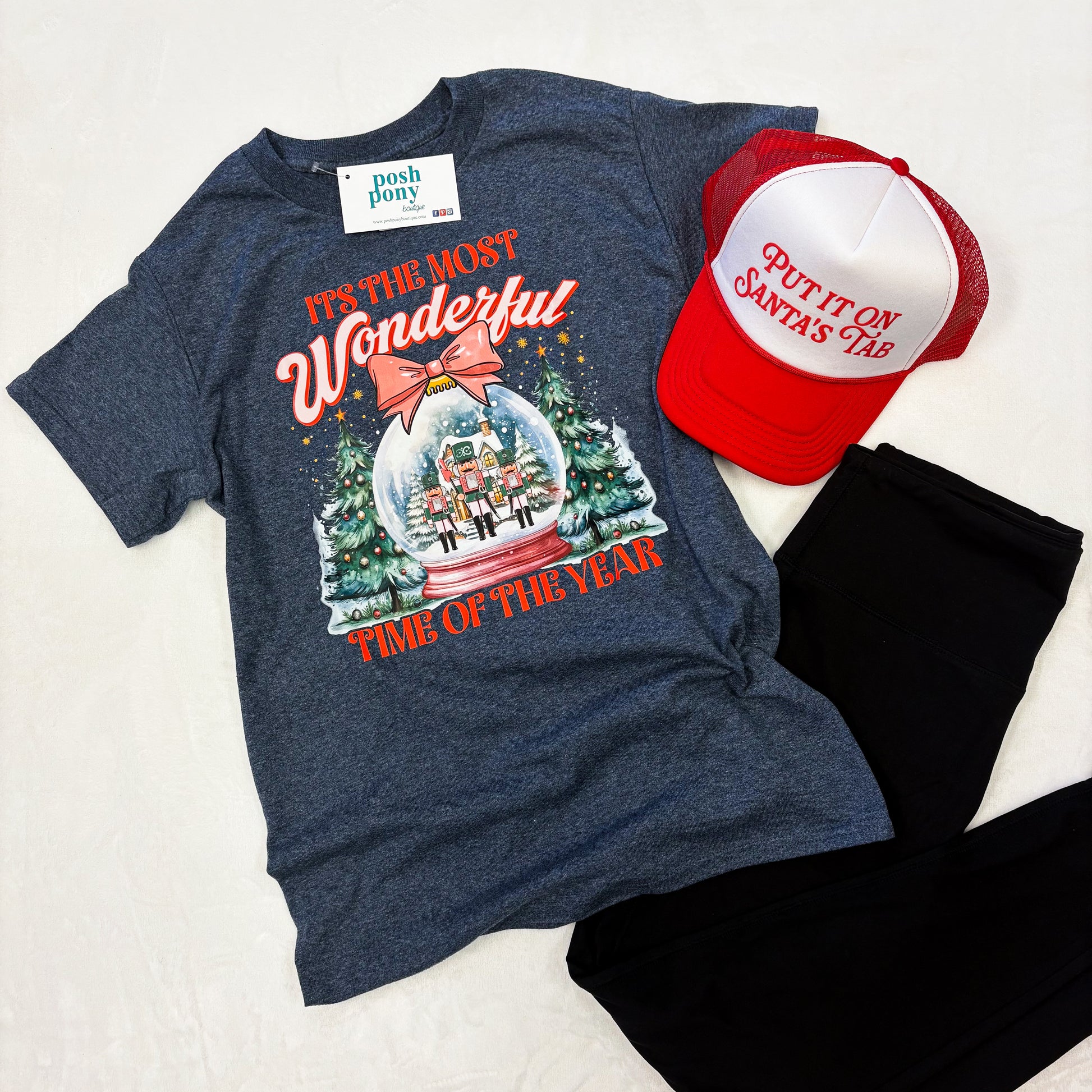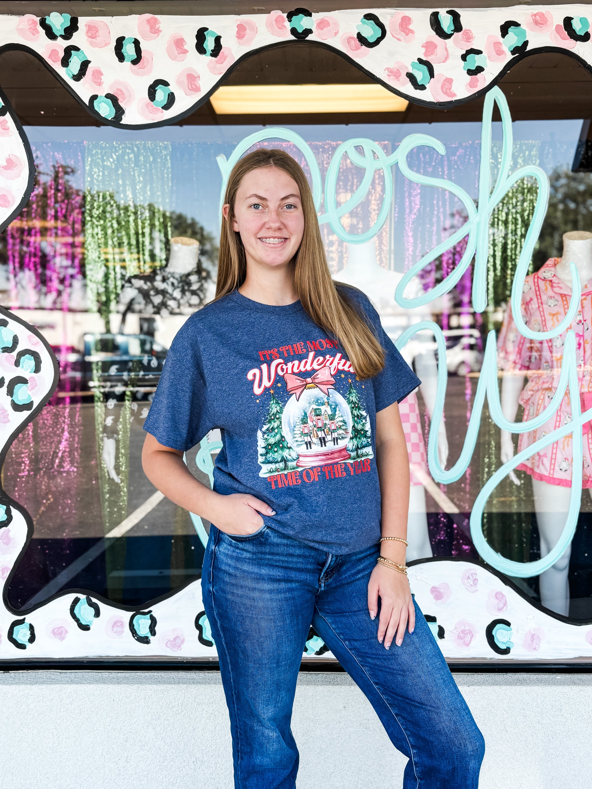 Snow Globe DTF on Heather navy Gildan tee with crew neck and short sleeves
