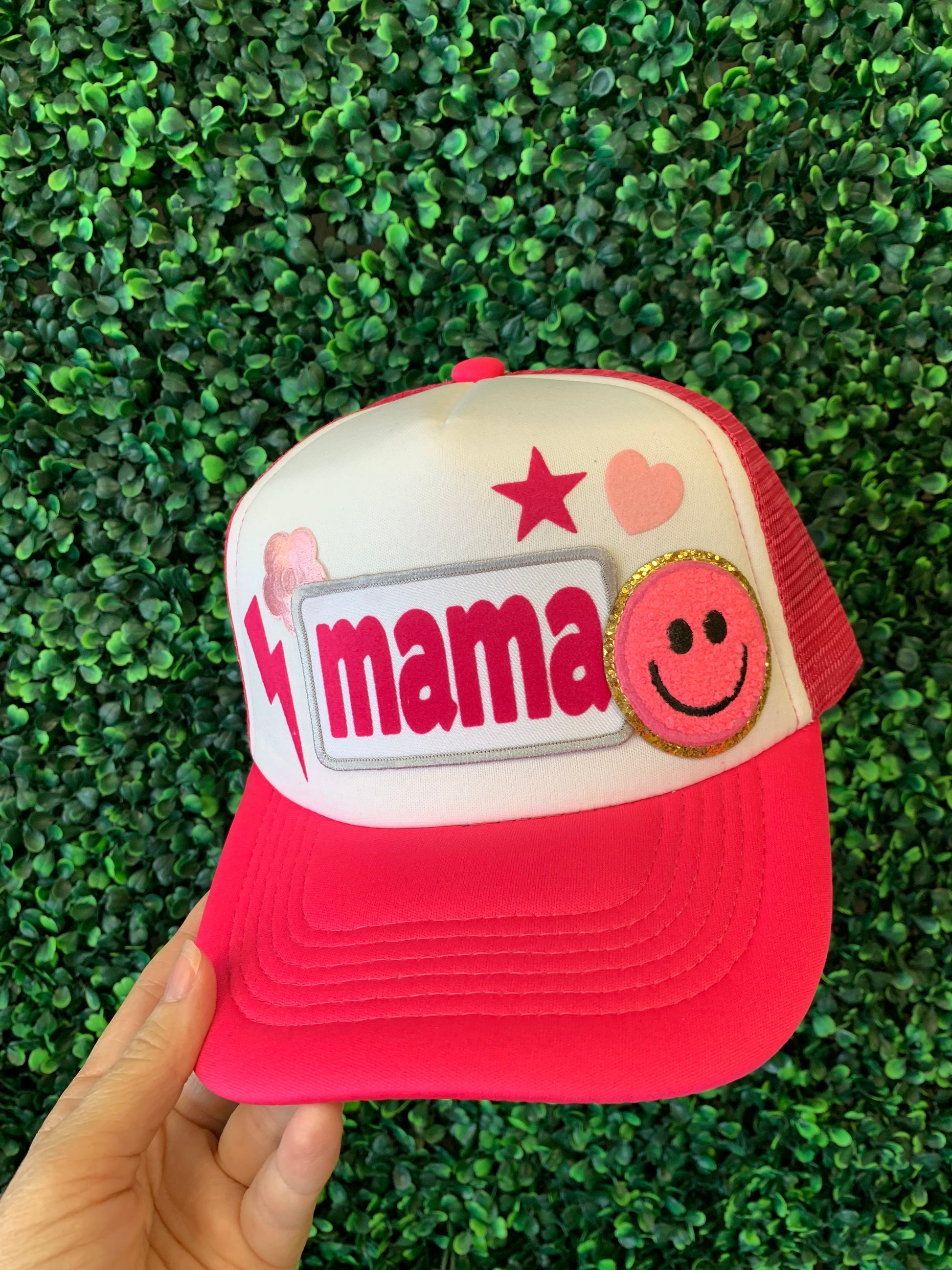 Trucker Hat adorned with various styles of patches including felt, sequined, chenille, and glitter.