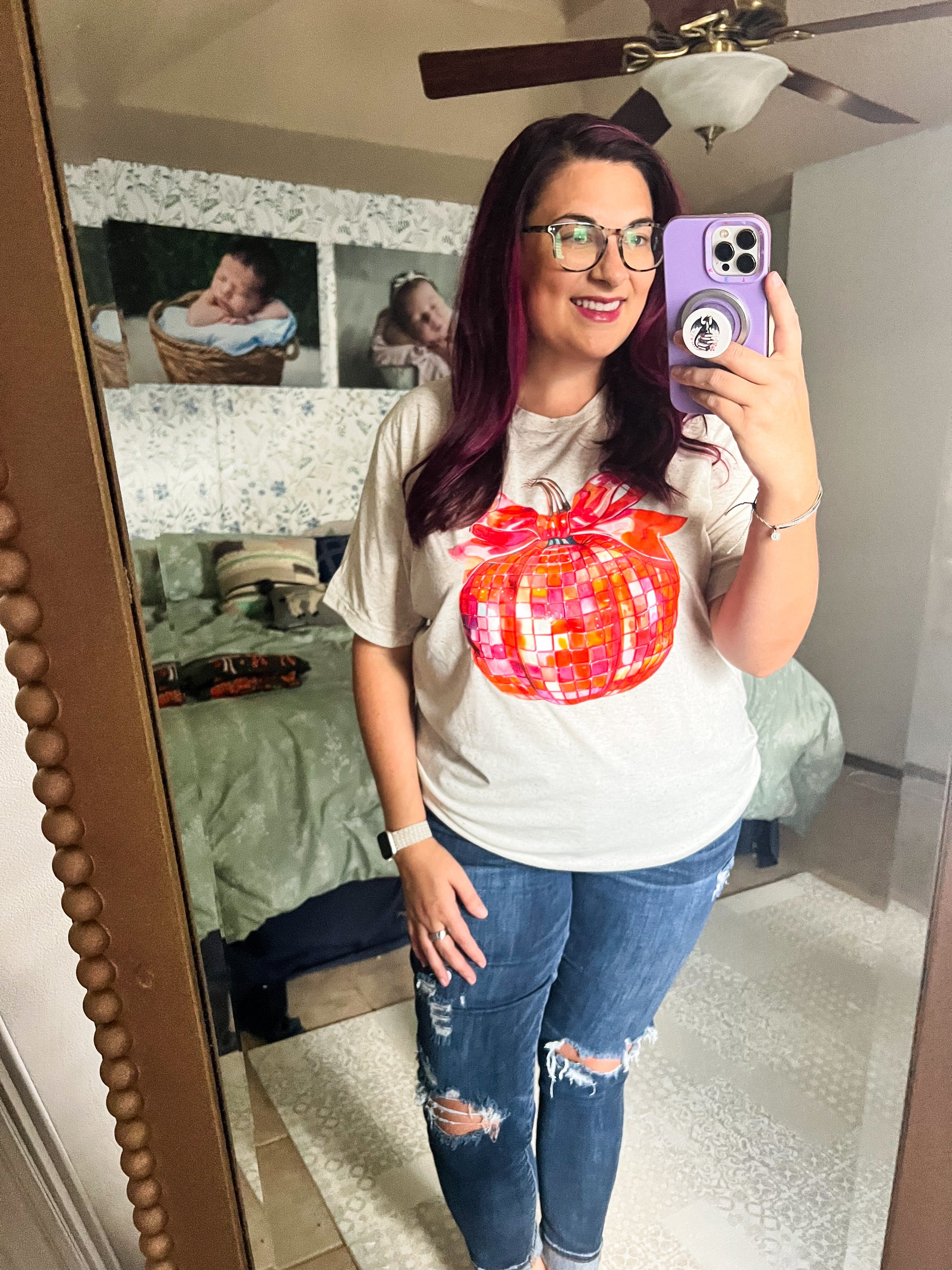 Pink and Orange Mosaic printed pumpkin on an oatmeal fleck Bella canvas tee.