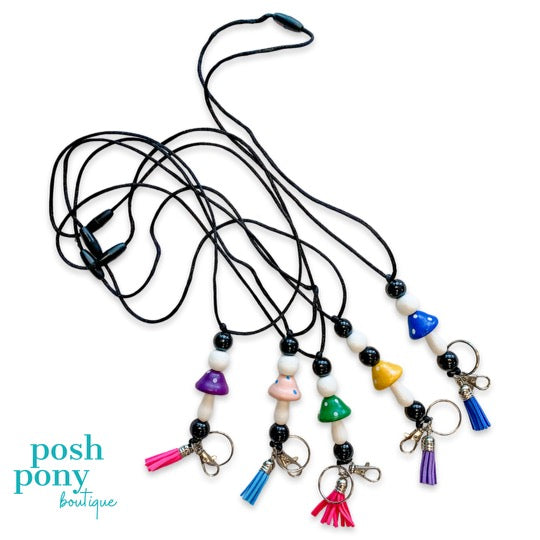Breakaway lanyard with wooden beads, clip for badge holder and a ring to add keys.