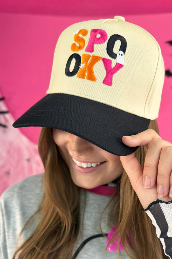 Bring your Spooky Vibes to any party when you show up in this trucker hat. Cream colored crown and a black bill with Spooky embroidered adornment and buckle adjustment/closure in the back.