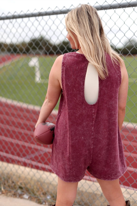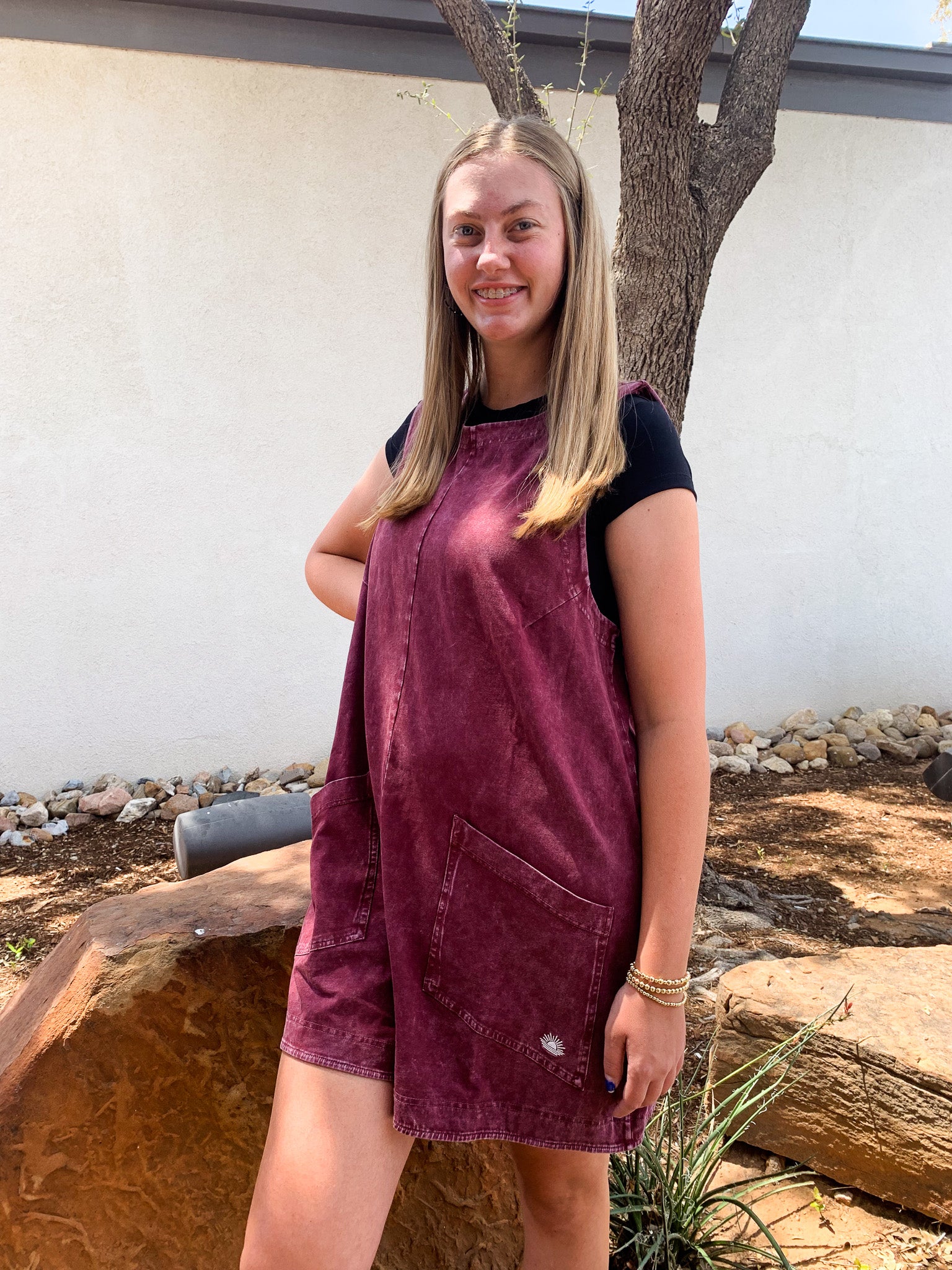 Trendy and stylish mineral wash romper features a button keyhole closure in the back that is great to pair with a cute bralette or tank top. You will love the comfort of the soft/slightly stretchy fabric and the true to size/flattering fit. Did we mention POCKETS? The front pockets are big enough to keep your tickets, id, phone and money of course!