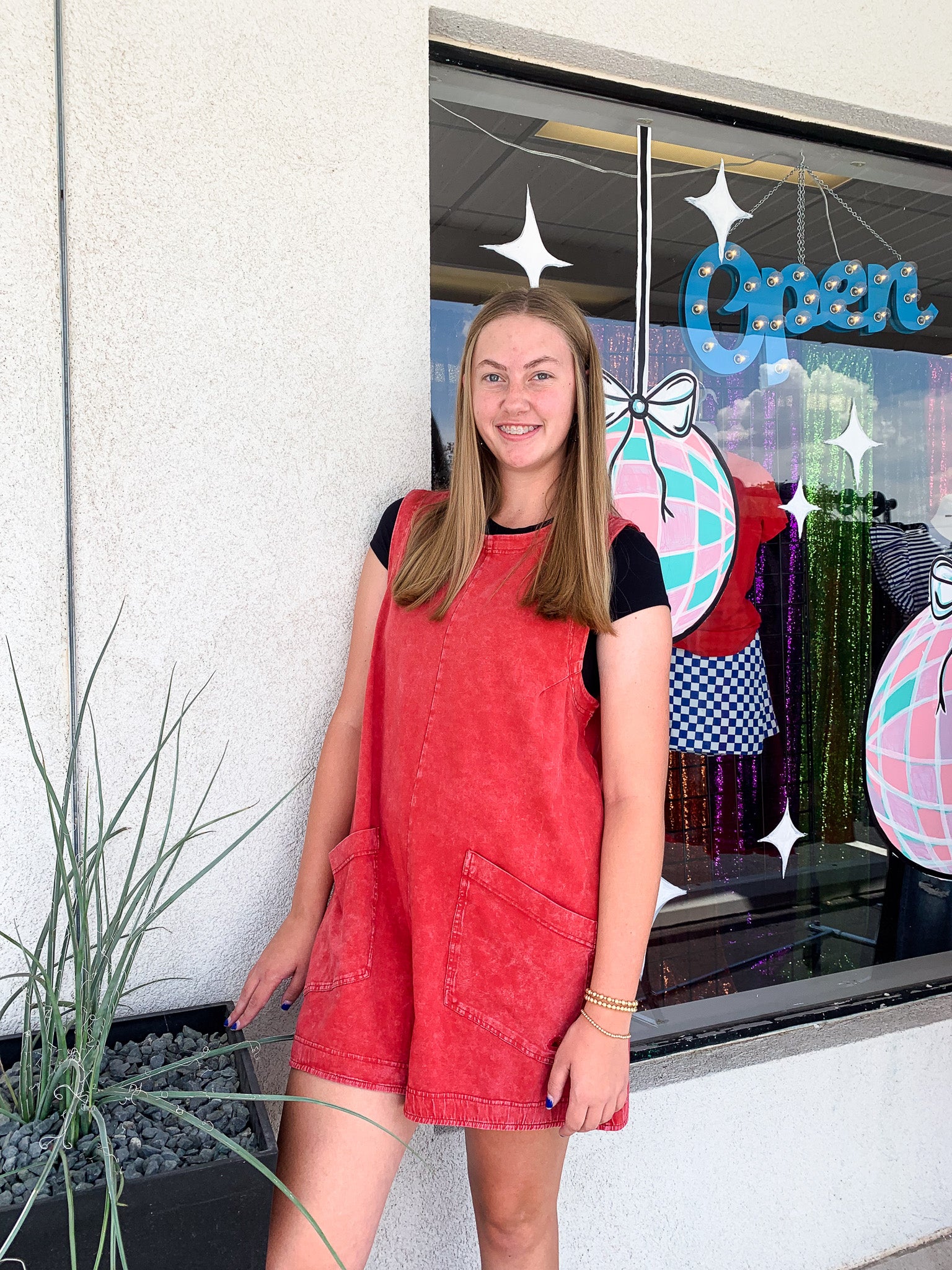 Trendy and stylish mineral wash romper features a button keyhole closure in the back that is great to pair with a cute bralette or tank top. You will love the comfort of the soft/slightly stretchy fabric and the true to size/flattering fit. Did we mention POCKETS? The front pockets are big enough to keep your tickets, id, phone and money of course!